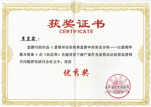 近日,浦口区检察院第五检察部干警李昱霖撰写的论文《虚假诉讼在检察监督中的实证分析——以虚假仲裁为视角》在《民法典》实施背景下破产案件及虚假诉讼检察监督相关问题研究研讨会征文中荣获“优秀奖”。