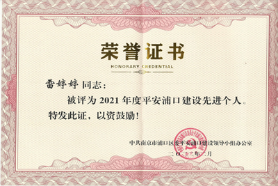 近日,在浦口区委、区政府组织开展的平安浦口建设中,浦口区检察院第一检察部获评“2021年度平安浦口建设先进集体”,雷婷婷同志获评“2021年度平安浦口建设先进个人”。