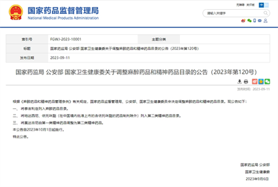 2.2023年9月6日,国家药品监督管理局、公安部、国家卫生健康委员会联合发布《关于调整麻醉药品和精神药品目录的公告》,其中将依托咪酯(在中国境内批准上市的含依托咪酯的药品制剂除外)列入第二类精神药品目录,公告自2023年10月1日起施行。
