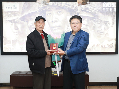 王俊检察长为达应松同志佩挂由中共中央、国务院、中央军委颁发的“中国人民志愿军抗美援朝出国作战70周年”纪念章,并送上鲜花。这枚纪念章,不仅是历史的凝聚、光荣的象征,更是对所有参战老战士的崇高敬意。