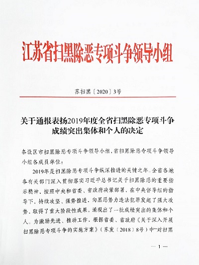 为激励先进、推动工作,进一步夺取扫黑除恶专项斗争的全面胜利,省扫黑除恶专项斗争领导小组决定,对在2019年扫黑除恶专项斗争的关键之年中成绩突出的地区、单位和个人进行通报表扬,浦口区检察院管品同志获得先进个人的称号,也是我区唯一一位获得此荣誉的同志,这也是区委领导对浦口区检察院扫黑除恶专项斗争工作的高度肯定。